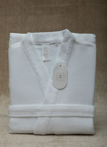 This bathrobe combines comfort with understated elegance. The exterior with a waffle texture for a lightweight, contemporary feel, while the interior is